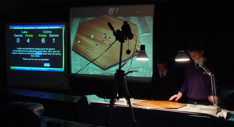 Penny Black is by far the most popular penny game. Its the one you should try first, and in playing it you will learn the basic flicking skills required to play the other penny games. Remember that the push shot and penny diameter rules are especially important to the full enjoyment of this sensational game. The photograph below shows the final of a Penny Black knock out competition at Menzies High School. |