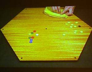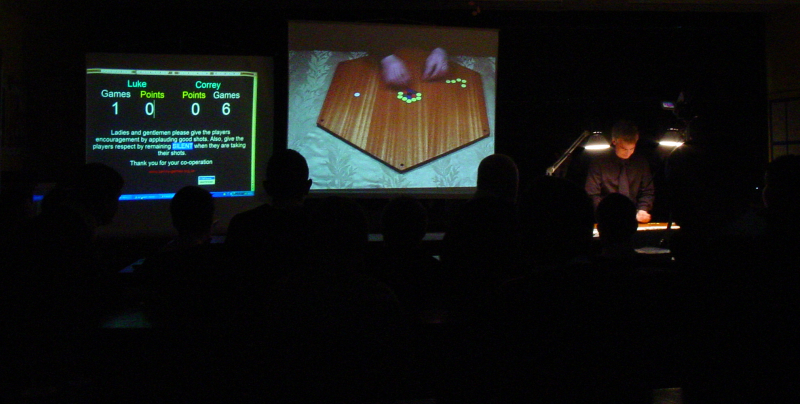 ![]() "I didn't make a board to begin with. Well, I didn't know if she'd like the game, see. So I bought some coloured stickers off the web and made a set of pennies. I had some pieces of old chipboard furniture lying around in the garage so we used a piece of that for the board. Quick spray, you know. "We all play with her now. Play each other, too. Made an eighteen inch board at first. Now we've got a two footer. Square." |