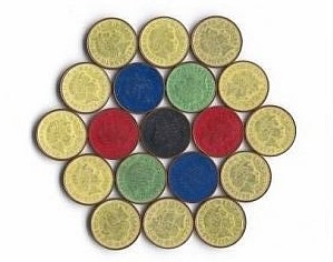 All you need is nineteen pennies and a flat waxed board. Square boards are popular because they are easy to make or get hold of, give you more playing surface area for your money, and marginally increase the skill level required of players. Traditional hexagonal boards mirror the shape pennies make at the start of a game, and for many people these are the only true Penny Black boards. Round boards are also used. |