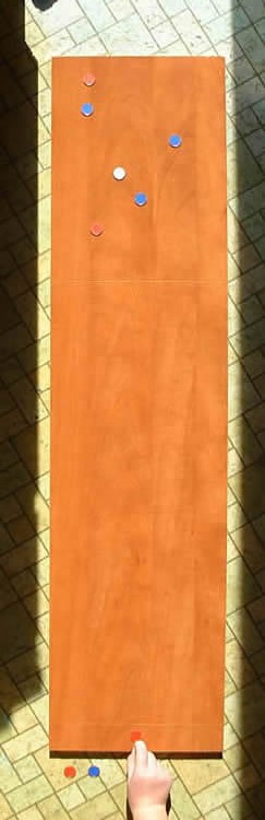 This is the 'penny' version of indoor bowls. It is simple and great fun. It does have some rules all of its own however. For example:If you knock the white off the board your opponent wins the end by one point. If you knock an opponent's penny off the board then he can remove one of your pennies. |