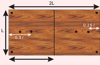 A Standard Penny Red board, for use with UK 1p pieces, or 5c euro, has a width of nine inches (imperial), two hundred and twenty nine millimetres (metric). A Tupenny Red board, for those players who, like me, prefer to use UK 2p pieces, has a board width of one foot (imperial), three hundred and five millimetres. Multiplication factors are given for anyone who wishes to experiment with a non standard sized board. The spots should have a diameter of not more than one centimetre. The centre of a corner spot should be about one and a half centimetres from the back and side of the board. The line should be about two millimetres thick. |