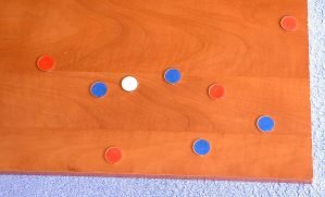 The start of every end begins with movement of the white. For beginners the white (or jack) is placed 10cm to 15cm over the 45cm line, and equidistant from the side edges of the board. If you have Flash Player installed click this link. For experienced players, the one who is to play first, flicks the white so that the whole of it goes over the 45cm line. When the white comes to rest it is moved sideways until it is equidistant from the side edges of the board. If you have Flash Player installed click this link. Players